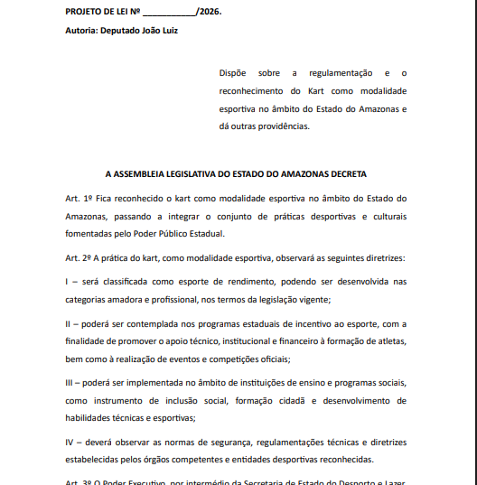 O kart pode ganhar status oficial de modalidade esportiva no Amazonas. Um projeto de lei apresentado pelo deputado estadual João Luiz (Republicanos), que tramita na Assembleia Legislativa do Estado do Amazonas (Aleam), propõe reconhecer a prática como parte do conjunto de esportes fomentados pelo poder público estadual.