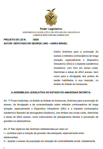 O deputado estadual Dr. George Lins (União Brasil), apresentou um projeto de lei que institui diretrizes para ampliar o acesso, a divulgação e a conscientização sobre métodos contraceptivos de longa duração no Amazonas, com foco especial em zonas rurais, comunidades ribeirinhas e áreas de difícil acesso.