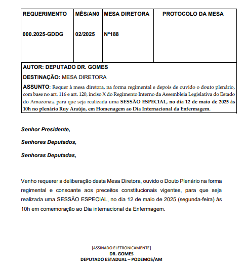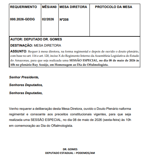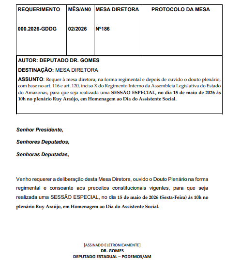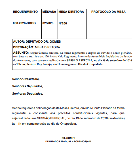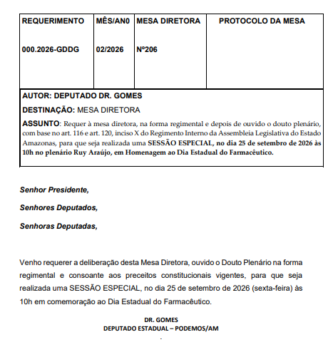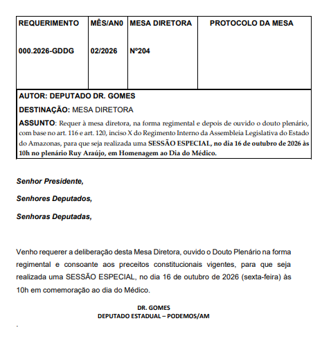 O deputado estadual Dr. Gomes (Podemos) protocolou uma série de requerimentos para a realização de sessões especiais no plenário da Assembleia Legislativa do Estado do Amazonas (Aleam), com o objetivo de homenagear profissionais de diferentes áreas e instituições de destaque no estado ao longo de 2026.