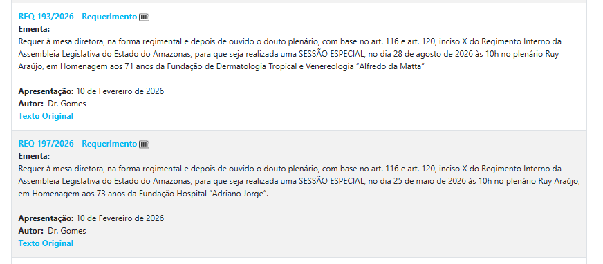 Os requerimentos apresentados por Dr. Gomes seguem agora em trâmite na Diretoria de Apoio Legislativo da Aleam.