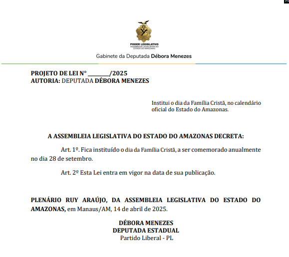A Assembleia Legislativa do Amazonas (Aleam) aprovou, na sessão desta quinta-feira (11/12), o projeto de lei da deputada estadual Débora Menezes (PL) que institui o Dia da Família Cristã no calendário oficial do Estado. A proposta segue agora para a Diretoria de Documentação, que fará o envio para sanção governamental.