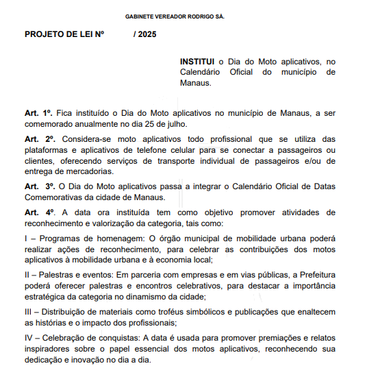 O vereador Rodrigo Sá (PP) protocolou um projeto de lei que propõe instituir o Dia do Moto Aplicativo no município de Manaus, a ser comemorado anualmente no dia 25 de julho. A data passará a integrar o Calendário Oficial de Datas Comemorativas da cidade, se aprovada.