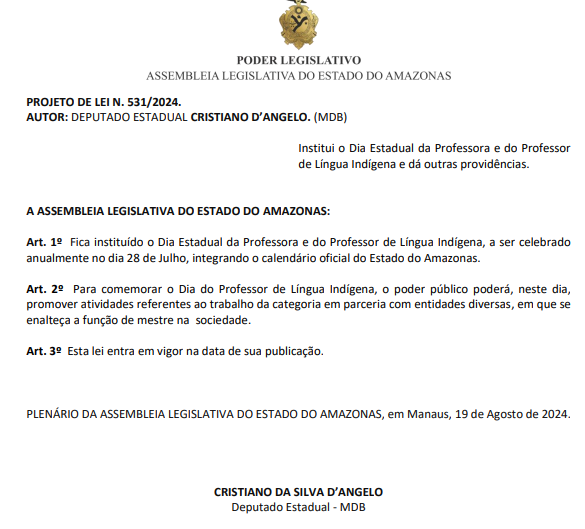 A Assembleia Legislativa do Estado do Amazonas (Aleam) aprovou, em sessão plenária realizada na última terça-feira (21/10), o Projeto de Lei de autoria do deputado estadual Cristiano D’Angelo (MDB), que institui o Dia Estadual da Professora e do Professor de Língua Indígena”, a ser comemorado anualmente em 28 de julho. O texto segue agora para sanção governamental.