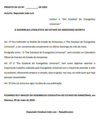 A Assembleia Legislativa do Amazonas (Aleam) aprovou, em sessão plenária realizada no dia 21 de outubro deste ano, o projeto de lei do deputado João Luiz (Republicanos) que institui o “Dia Estadual do Evangelista Universal”, a ser celebrado anualmente no último domingo do mês de maio.