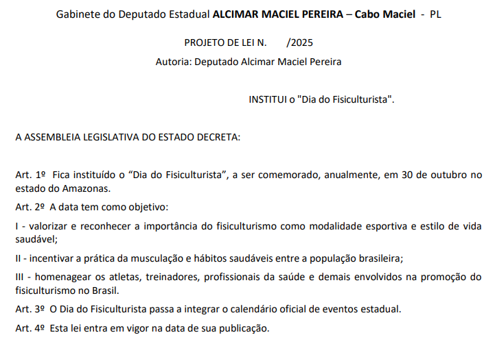 A Assembleia Legislativa do Estado do Amazonas (Aleam) aprovou, nesta terça-feira (21/10), um projeto de lei, de autoria do deputado estadual Cabo Maciel (PL), que institui no Estado o “Dia do Fisiculturista”, a ser comemorado anualmente em 30 de outubro. A proposta segue para sanção do governador do Amazonas Wilson Lima (União Brasil).