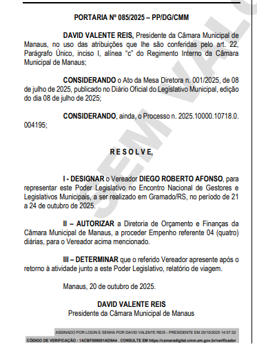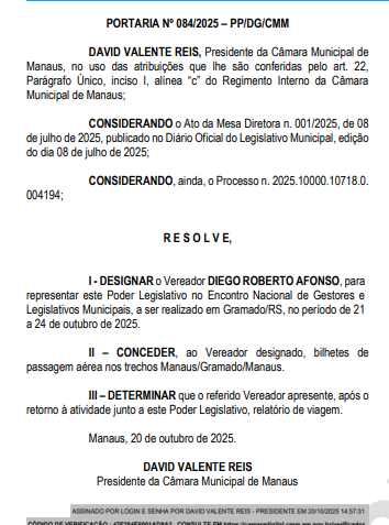 A confirmação está no Diário Oficial Eletrônico do Legislativo Municipal, por meio de duas Portarias que afirmam o pagamento das diárias para 4 dias e dos bilhetes de passagem aérea nos trechos Manaus/Gramado/Manaus, e as duas inscrições para a participação do evento. Ambos assinados pelo presidente da CMM David Reis (Avante).