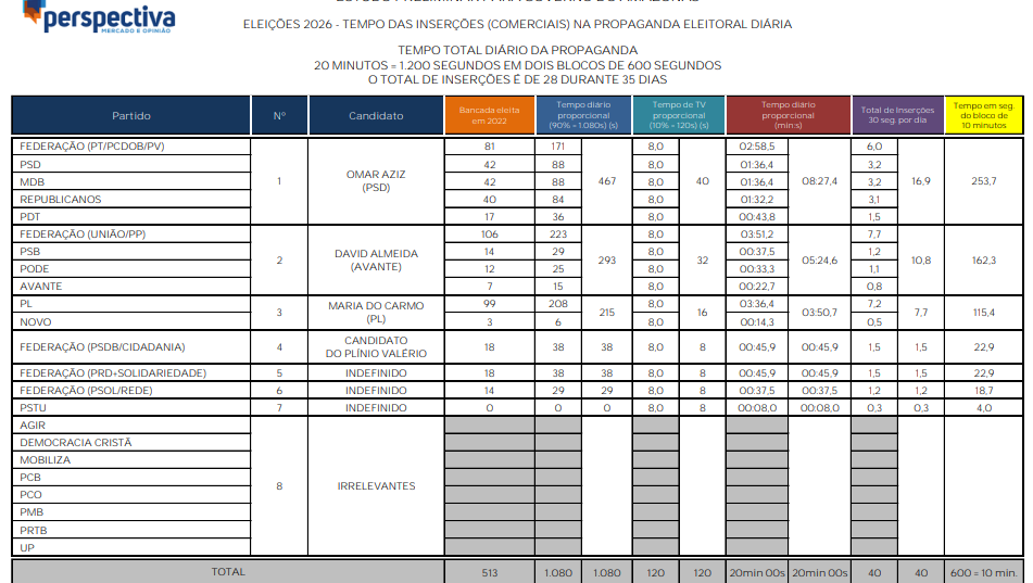 Um levantamento prévio intitulado “Estudo da Distribuição do Tempo de TV e Rádio – Eleições 2026 (Governo do Amazonas)” projeta como poderá ser a divisão do tempo de propaganda eleitoral gratuita entre os candidatos ao governo do Estado nas eleições de 2026. O estudo, divulgado pelo Instituto Perspectiva, é baseado na legislação eleitoral vigente e nas bancadas eleitas em 2022, considera também as federações e fusões partidárias já consolidadas ou previstas até o próximo pleito.