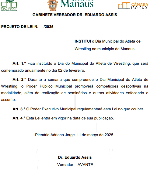 A Câmara Municipal de Manaus (CMM) vai analisar um Projeto de Lei (PL) de autoria do Dr. Eduardo Assis (Avante) que institui o Dia Municipal do Atleta de Wrestling, a ser comemorado anualmente no dia 2 de fevereiro.