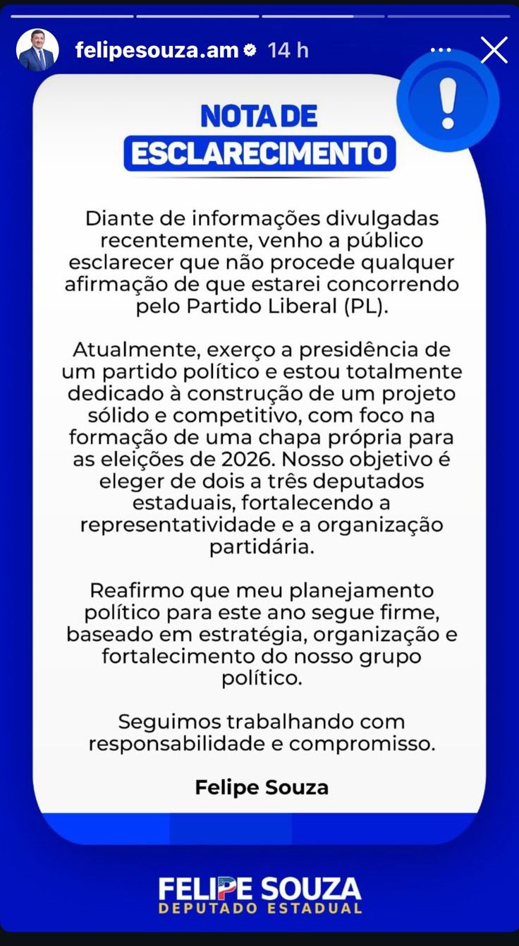O deputado estadual Felipe Souza (PRD) divulgou uma nota de esclarecimento nas redes sociais para desmentir especulações sobre uma possível filiação ao Partido Liberal (PL). Segundo ele, “não procede qualquer afirmação” de que estaria se preparando para disputar eleições pela sigla.