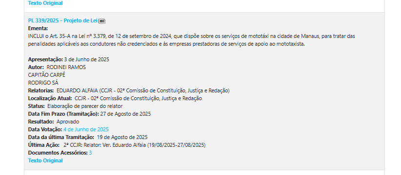 O mais conhecido desses projetos foi o PL nº 339/2025, que propôs alterar a lei de regulamentação do serviço de mototáxi em Manaus, estabelecendo penalidades à atuação irregular de condutores e empresas de plataformas digitais.