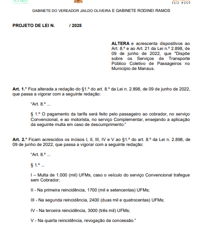 PL 133/2025: Que dispõe sobre os Serviços de Transporte Público Coletivo de Passageiros no Município de Manaus;