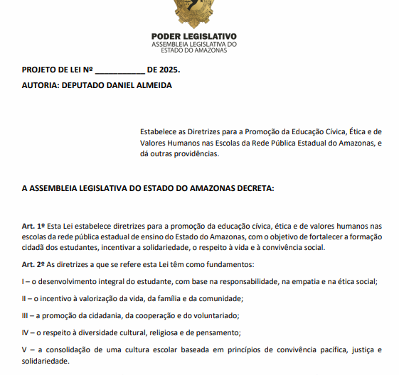 O deputado estadual Daniel Almeida (Avante) protocolou um projeto de lei na Assembleia Legislativa do Estado do Amazonas (Aleam) que estabelece diretrizes para promover educação cívica, ética e valores humanos nas escolas da rede pública estadual. A proposta busca fortalecer a formação cidadã dos estudantes, incentivando princípios como solidariedade, respeito à vida, convivência pacífica e empatia.