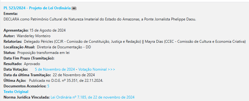 Entre os exemplos estão propostas como Dia do Despachante de Veículos, reconhecimento da Arena da Amazônia e da Ponte Jornalista Phelippe Daou como patrimônio cultural imaterial e datas voltadas a categorias profissionais.