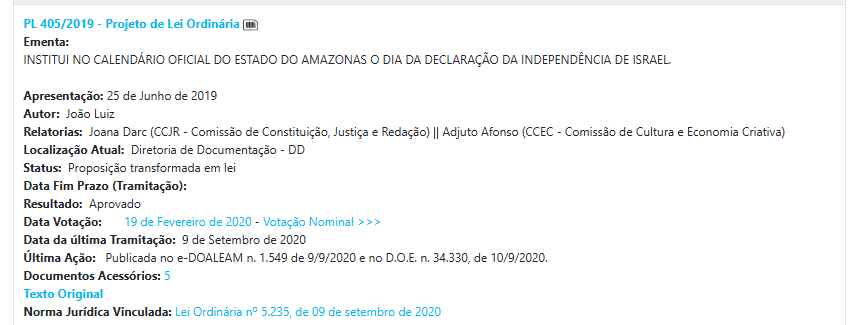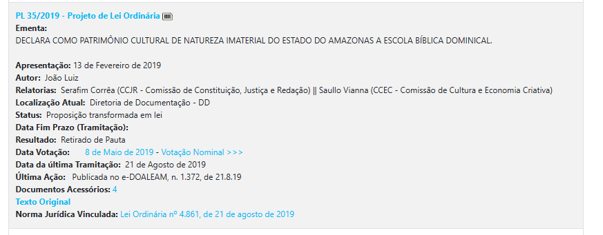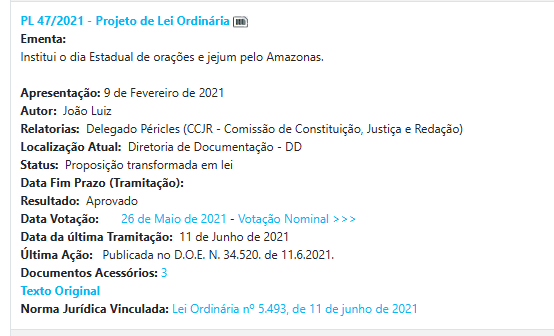 O padrão se manteve nos anos seguintes. Em 2020, surgiram iniciativas como o reconhecimento do cultivo de abacaxi de Novo Remanso como patrimônio cultural. Em 2021, o deputado propôs o Dia Estadual de orações e jejum.