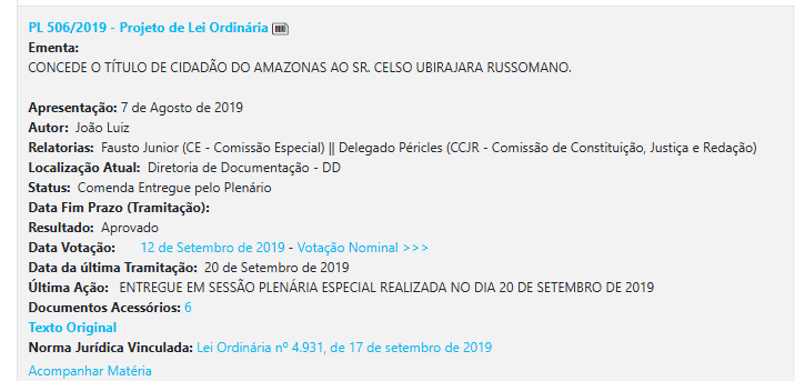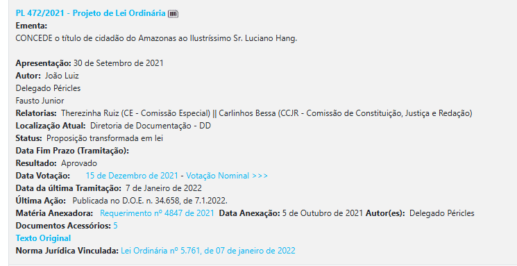 Outro ponto recorrente no mandato é a concessão de títulos de cidadão amazonense. Mesmo sendo uma prática comum nas casas legislativas, o uso frequente desse tipo de proposta reforça a percepção de um mandato mais voltado ao reconhecimento simbólico do que à produção de políticas públicas estruturantes.