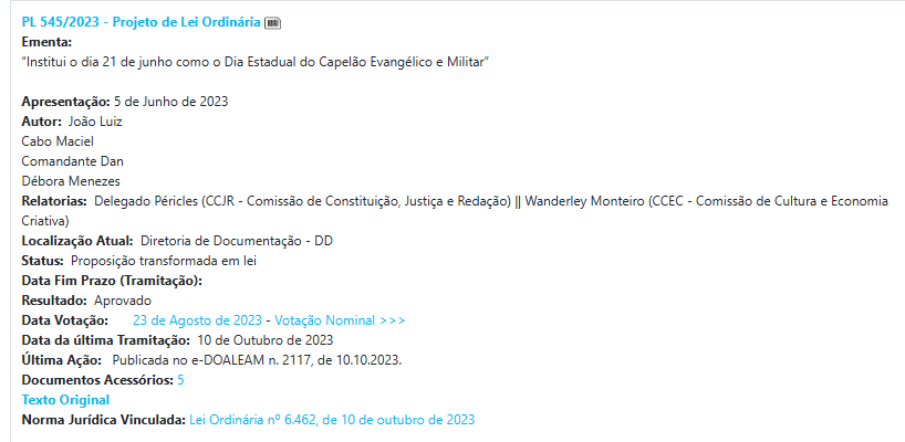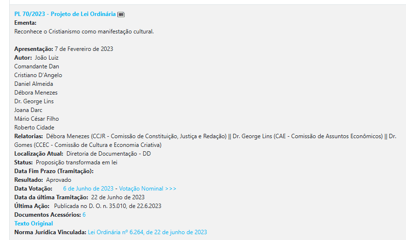 Já entre 2023 e 2024, a produção legislativa ampliou ainda mais o foco religioso. Foram criados o Dia do Cristão, o Dia do Obreiro, a Semana Estadual da Cultura Cristã, além de outras datas e campanhas com forte conteúdo simbólico.