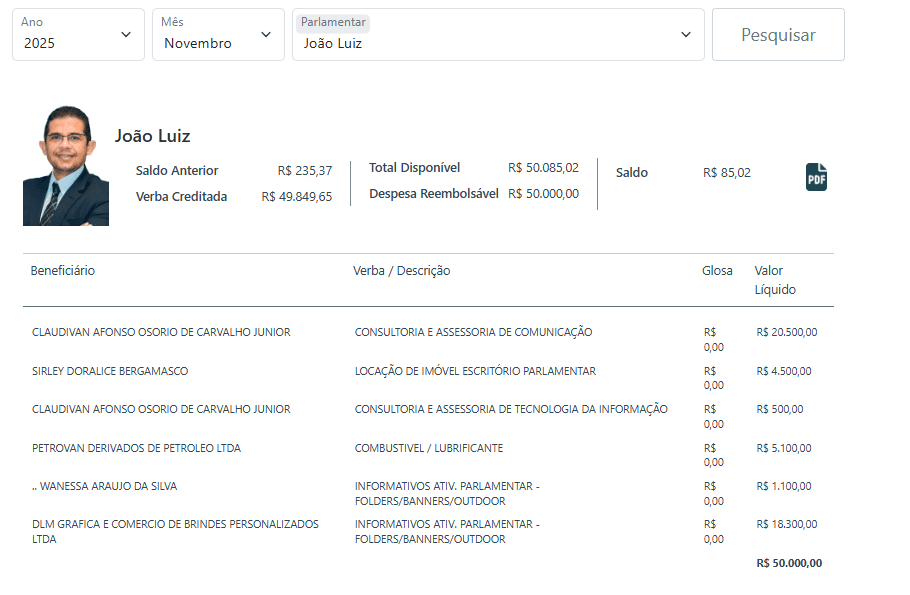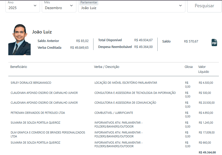 Os dados do Sistema de Apoio ao Processo Legislativo (SAPL) também revelam um padrão consistente no uso da cota parlamentar ao longo de 2025. O gabinete utilizou praticamente toda a verba mensal disponível.