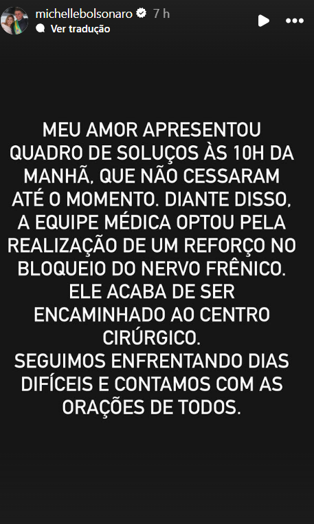 Mais cedo, a ex-primeira-dama Michelle Bolsonaro utilizou as redes sociais para atualizar o estado de saúde do marido. Segundo ela, os soluços começaram pela manhã e persistiram ao longo do dia, motivando a decisão médica pelo novo procedimento.