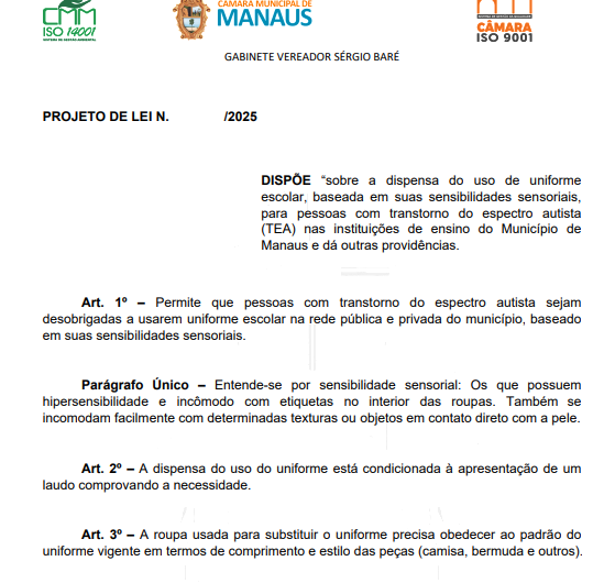 O vereador Sérgio Baré (PRD) protocolou um Projeto de Lei na Câmara Municipal de Manaus (CMM) que busca assegurar mais inclusão e respeito às particularidades de estudantes com Transtorno do Espectro Autista (TEA) nas escolas de Manaus. A proposta permite que crianças e adolescentes autistas sejam dispensados do uso obrigatório de uniformes escolares, tanto na rede pública quanto na privada, quando houver comprovação de sensibilidades sensoriais.