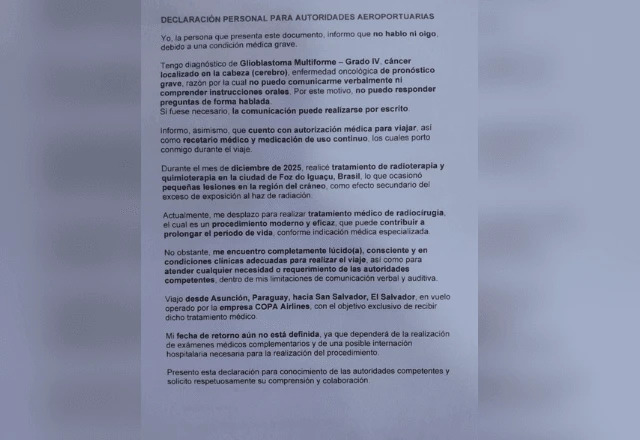 No documento, redigido em espanhol, Vasques afirma ter diagnóstico de glioblastoma multiforme grau IV, um tipo de câncer localizado no cérebro, de prognóstico considerado grave. Segundo o texto, a doença o impediria de se comunicar verbalmente e de compreender instruções orais, razão pela qual solicita que toda comunicação com autoridades seja feita por escrito.