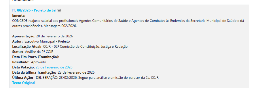 Na justificativa enviada aos vereadores, o Executivo destaca que a medida consolida o dever da administração pública de assegurar a adequação remuneratória mínima legalmente garantida às categorias, além de promover a valorização dos profissionais que atuam diretamente na atenção básica e no combate às endemias.