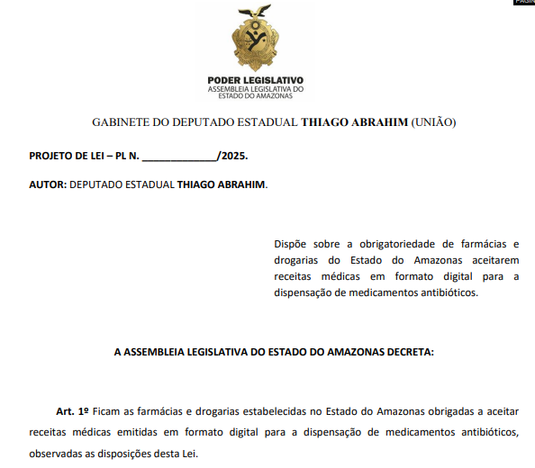 O deputado estadual Thiago Abrahim (União Brasil) protocolou um projeto de lei na Assembleia Legislativa do Estado do Amazonas (Aleam), que obriga todas as farmácias e drogarias do Amazonas a aceitarem receitas médicas emitidas em formato digital para a dispensação de antibióticos. A iniciativa busca padronizar o atendimento, garantir segurança jurídica e ampliar o acesso da população aos tratamentos, especialmente em casos que exigem início imediato da medicação.