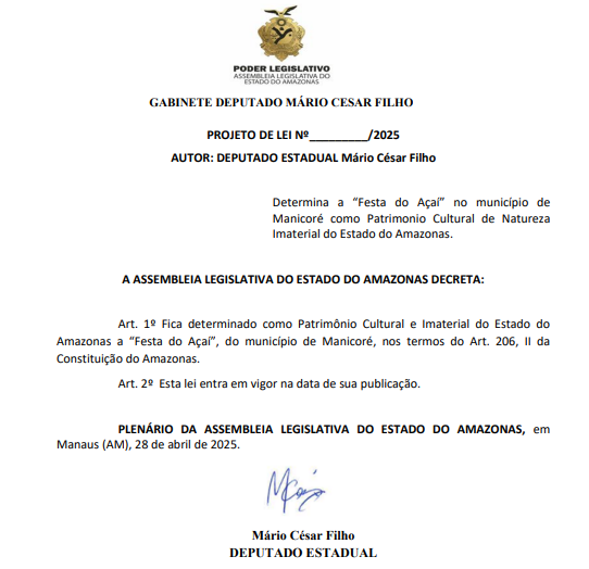 “A cultura popular é essencial para a manutenção da memória, da história e dos modos de vida que moldam nossas comunidades. Reconhecer a Festa do Açaí como patrimônio cultural imaterial é preservar a tradição, a história e os costumes da população de Manicoré”, destacou na justificativa.