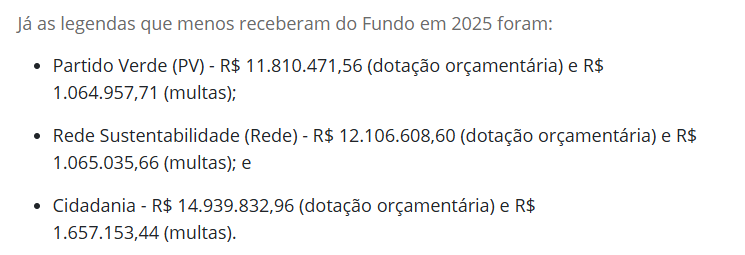 Entre os partidos que receberam os menores volumes de recursos estão o Partido Verde, com R$ 11,8 milhões em dotação e R$ 1,06 milhão em multas, a Rede Sustentabilidade, que recebeu R$ 12,1 milhões e R$ 1,06 milhão, e o Cidadania, com R$ 14,9 milhões em dotação orçamentária e R$ 1,6 milhão em multas.