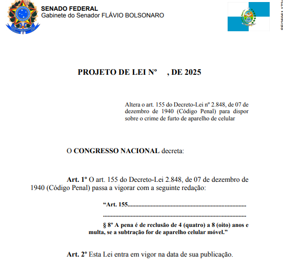 O Projeto de Lei (PL) 494/2025, que prevê o aumento da pena para o crime de furto de aparelhos celulares, aguarda votação na Comissão de Segurança Pública do Senado. A proposta é de autoria do senador Flávio Bolsonaro (PL-RJ), que também preside o colegiado responsável pela análise do texto.