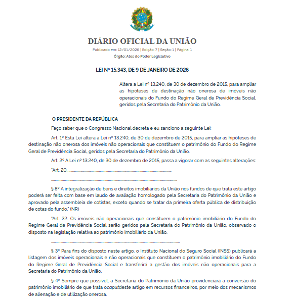 Imóveis públicos atualmente sem uso poderão passar a ter destinação social em áreas urbanas de todo o Brasil. Foi sancionada pelo presidente Lula e publicada no Diário Oficial da União (DOU) desta segunda-feira (12/1) a Lei 15.343, que autoriza o uso gratuito de bens ociosos ligados ao Fundo do Regime Geral de Previdência Social para ações de interesse público.