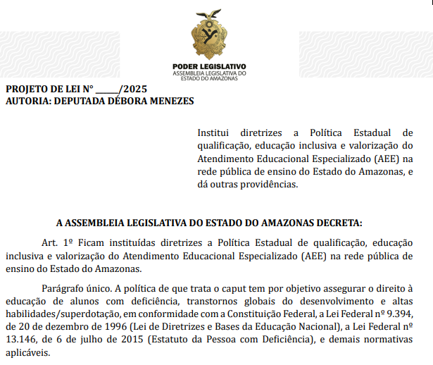 A deputada estadual Débora Menezes (PL) protocolou na Assembleia Legislativa do Amazonas (Aleam) um projeto de lei que institui a Política Estadual de Qualificação, Educação Inclusiva e Valorização do Atendimento Educacional Especializado (AEE) na rede pública de ensino.