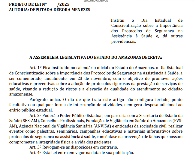 Está em tramitação na Assembleia Legislativa do Amazonas (Aleam) um Projeto de Lei de autoria da deputada estadual Débora Menezes (PL) que institui o Dia Estadual de Conscientização sobre a Importância dos Protocolos de Segurança na Assistência à Saúde. A data será celebrada anualmente em 23 de novembro e passará a integrar o calendário oficial do Estado.
