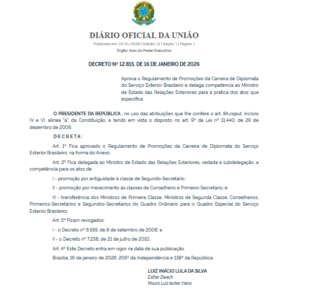 O presidente Luiz Inácio Lula da Silva (PT) aprovou um novo regulamento para as promoções na carreira de diplomata do Serviço Exterior Brasileiro. O decreto foi publicado no Diário Oficial da União (DOU) desta segunda-feira (19/1) e revoga normas que estavam em vigor desde 2008 e 2010.
