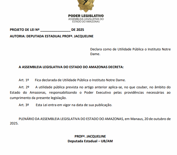 A deputada estadual Professora Jacqueline (UB) apresentou seu primeiro projeto de lei na Assembleia Legislativa do Amazonas (Aleam), propondo declarar o Instituto Notre Dame como Utilidade Pública Estadual. A proposta foi protocolada nesta terça-feira (4/11), conforme consulta da Rede Onda Digital ao SAPL (Sistema de Apoio ao Processo Legislativo).