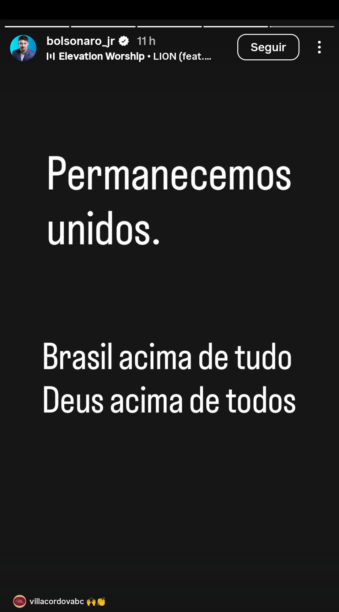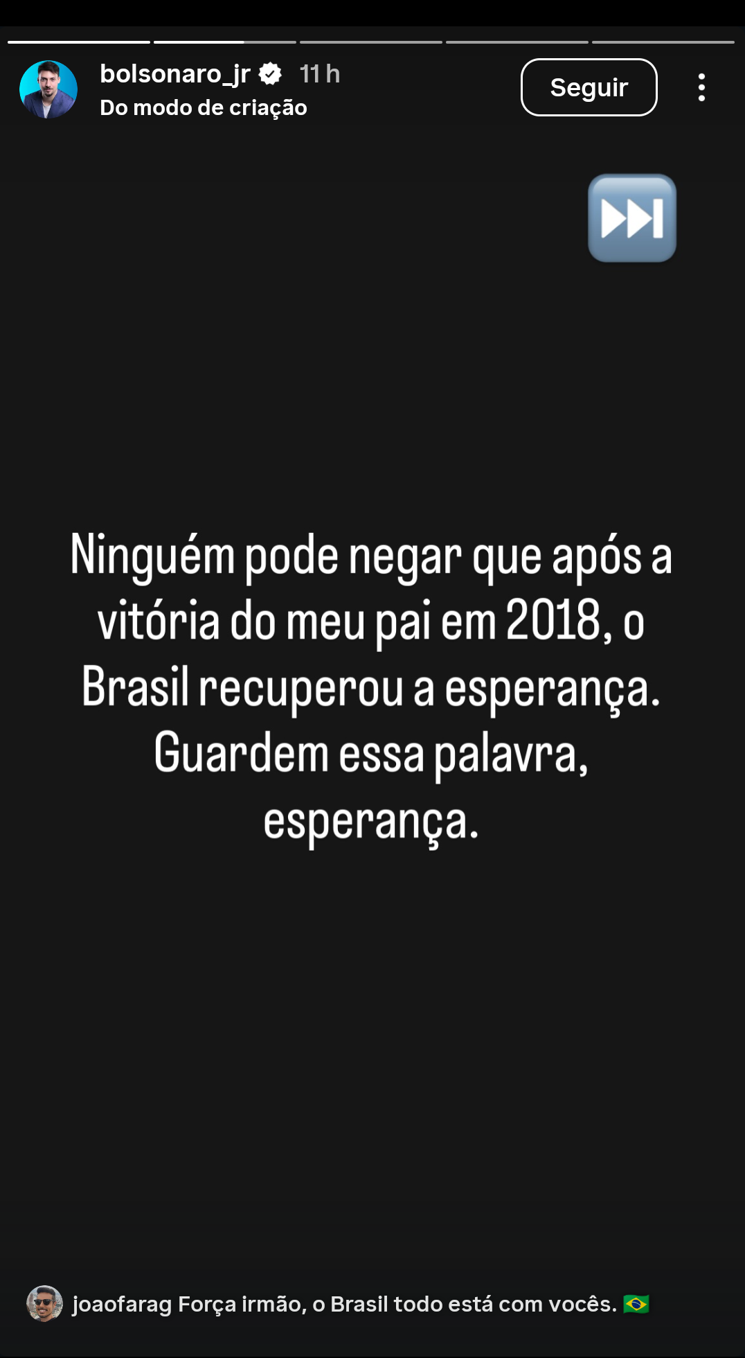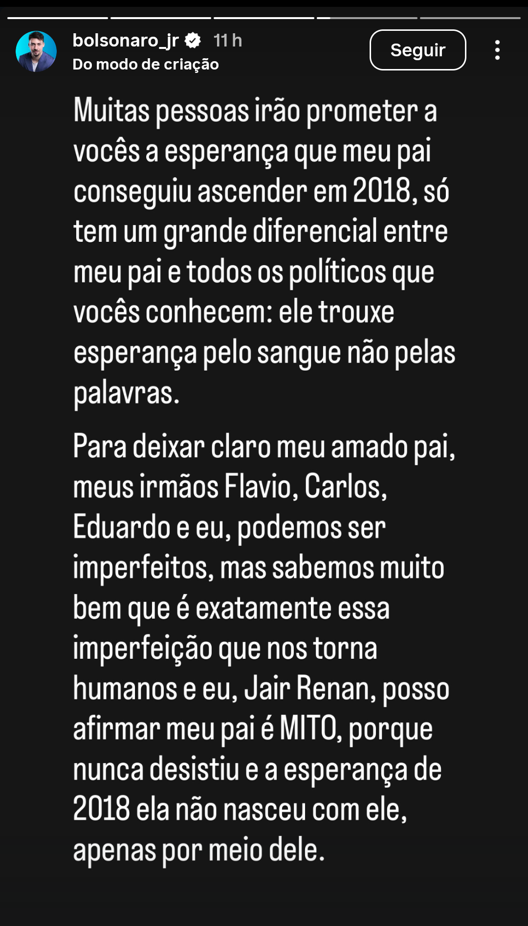 “Ninguém pode negar que após a vitória do meu pai em 2018, o Brasil recuperou a esperança. Guardem essa palavra: esperança”, escreveu.