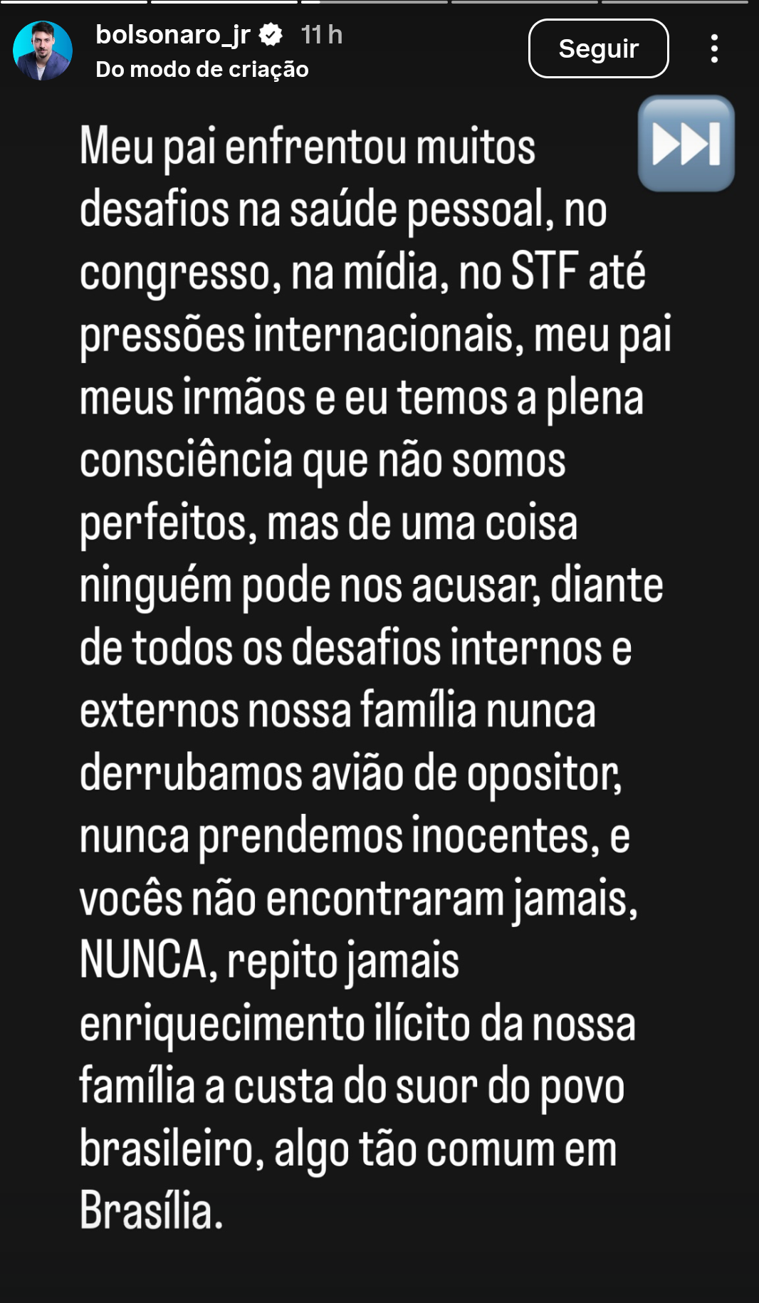 Em outro trecho, afirmou que o pai enfrentou pressões de diversos lados “na saúde pessoal, no Congresso, na mídia, no STF e até internacionalmente”, mas reiterou que nenhum deles cometeu abuso de poder.