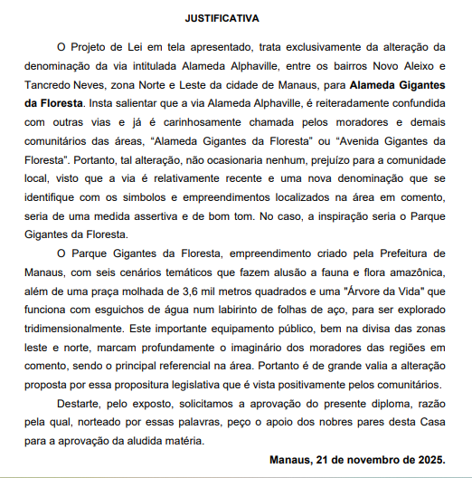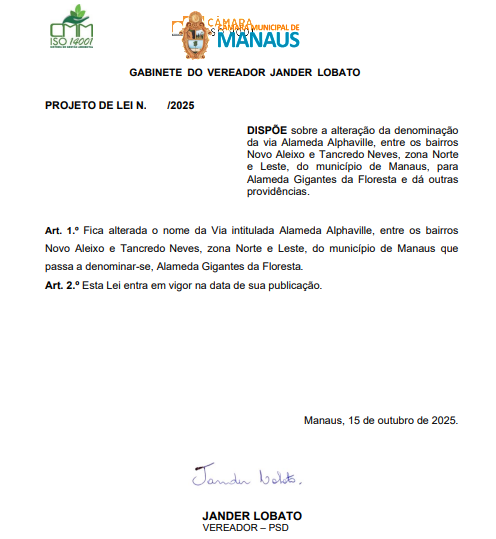 O vereador Jander Lobato (PSD) protocolou na Câmara Municipal de Manaus (CMM) um projeto de lei que altera oficialmente o nome da Alameda Alphaville, localizada entre os bairros Novo Aleixo e Tancredo Neves, nas zonas Norte e Leste da capital. Caso aprovado, o trecho passará a se chamar Alameda Gigantes da Floresta.