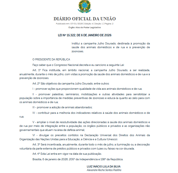 O presidente Luiz Inácio Lula da Silva (PT) sancionou a Lei nº 15.322/2026, que institui a campanha Julho Dourado, voltada à promoção da saúde de animais domésticos e de rua e à prevenção de zoonoses. A medida foi publicada no Diário Oficial da União (DOU) desta quarta-feira (7/1), e também leva a assinatura do ministro da Saúde, Alexandre Padilha.