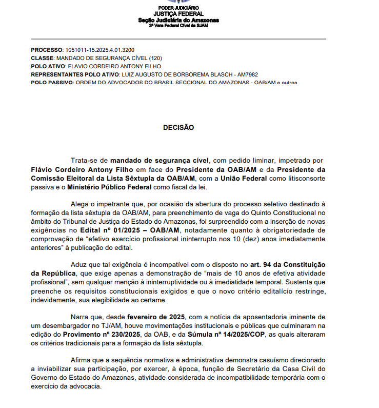 A decisão determina ainda a intimação da OAB-AM, da Comissão Eleitoral e da União Federal em 72 horas, e encaminha os autos ao Ministério Público Federal.