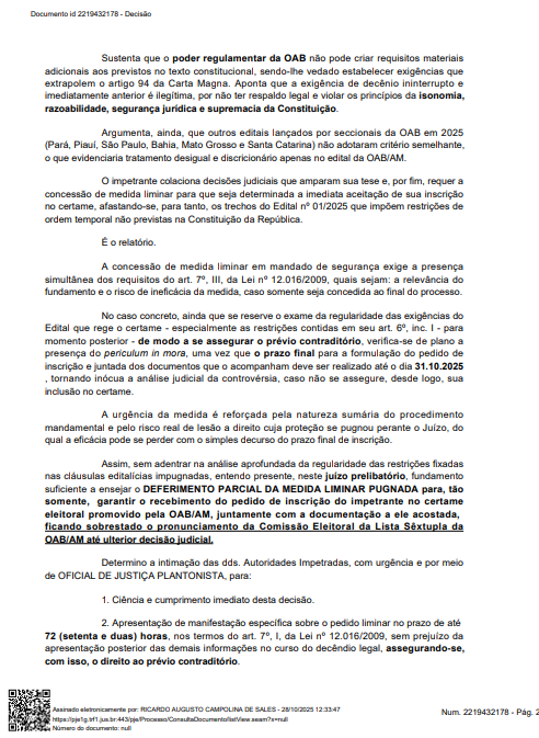 O juiz considerou que há risco de dano irreparável pelo término do prazo de inscrição, marcado para 31 de outubro de 2025, e apontou plausibilidade jurídica na tese de Antony de que a exigência de “10 anos de exercício ininterrupto imediatamente anteriores” contraria o artigo 94 da Constituição Federal, que não prevê continuidade nem imediatidade temporal.