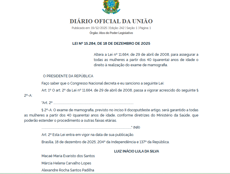 Foi publicada no Diário Oficial da União desta sexta-feira (19/12), a Lei nº 15.284, que amplia o acesso das mulheres ao exame de mamografia pelo Sistema Único de Saúde (SUS). A partir de agora, o procedimento passa a ser garantido para mulheres a partir dos 40 anos de idade. Antes da mudança, salvo situações específicas, o exame era oferecido apenas a partir dos 50 anos.