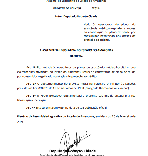 Uma lei em vigor no Amazonas garante que consumidores com o nome negativado em cadastros de proteção ao crédito não sejam impedidos de contratar planos de saúde. A medida é resultado de proposta apresentada pelo presidente da Assembleia Legislativa do Amazonas (Aleam), o deputado estadual Roberto Cidade (UB).