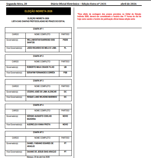 A corrida pela eleição indireta ao Governo do Amazonas ganhou forma oficial nesta segunda-feira (20/4). Publicação no Diário Oficial do Legislativo estadual confirmou o registro de cinco chapas que disputarão o comando do Executivo estadual, conforme as regras estabelecidas no edital do pleito.