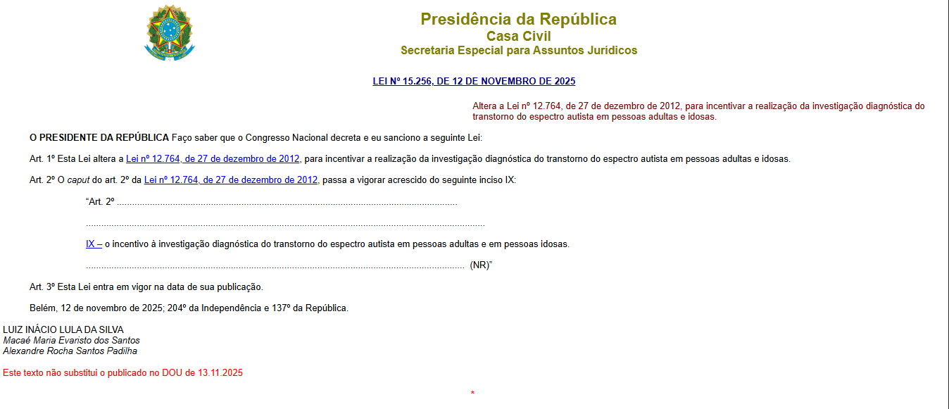 O presidente Luiz Inácio Lula da Silva (PT) sancionou, nesta quarta-feira (12/11), a Lei 15.256/2025, que amplia o incentivo ao diagnóstico de autismo para adultos e idosos. A norma altera a Política Nacional de Proteção dos Direitos da Pessoa com Transtorno do Espectro Autista (TEA), acrescentando um dispositivo que determina que a política pública deve promover a investigação diagnóstica também nessa faixa etária.