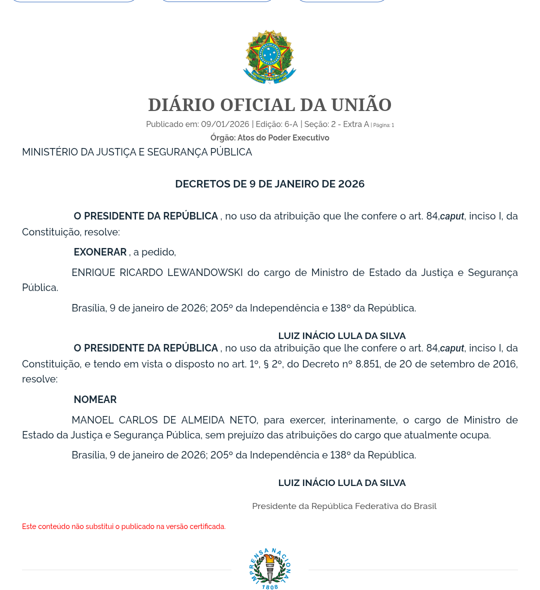 O presidente Luiz Inácio Lula da Silva (PT) nomeou o secretário executivo do Ministério da Justiça e Segurança Pública, Manoel Carlos de Almeida Neto, para comandar a pasta de forma interina. A designação foi publicada nesta sexta-feira (9/1) no Diário Oficial da União (DOU).