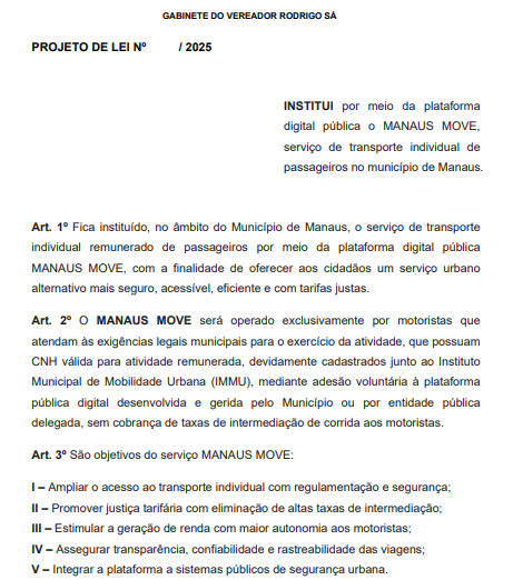 Pela proposta, o “Manaus Move” será operado exclusivamente por motoristas cadastrados no Instituto Municipal de Mobilidade Urbana (IMMU), que deverão possuir Carteira Nacional de Habilitação válida para atividade remunerada e realizar adesão voluntária à plataforma. Um dos diferenciais destacados é a não cobrança de taxas de intermediação, o que, segundo o vereador, pode garantir maior autonomia e aumento de renda para os motoristas.