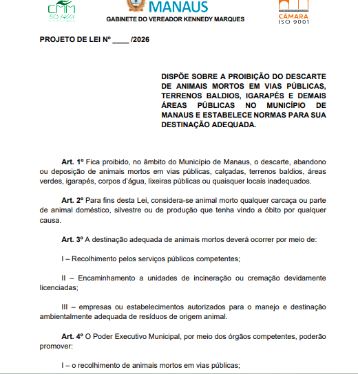 Um projeto de lei em tramitação na Câmara Municipal de Manaus (CMM) propõe aplicar multas e outras penalidades a quem descartar animais mortos de forma irregular na capital amazonense. A medida, de autoria do vereador Kennedy Marques (MDB) pretende coibir o abandono de carcaças em ruas, calçadas, igarapés, terrenos baldios e outros locais inadequados.