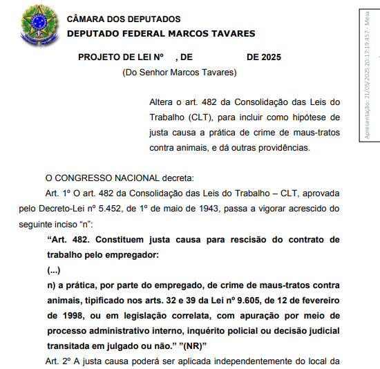 Na justificativa da proposta, o autor, deputado Marcos Tavares (PDT-RJ), argumenta que, embora o crime de maus-tratos a animais já esteja previsto na Lei de Crimes Ambientais, a legislação trabalhista ainda não trata expressamente essa conduta como motivo para dispensa por justa causa. De acordo com o deputado, a ausência dessa previsão gera insegurança jurídica, especialmente para setores que lidam diretamente com a causa animal.