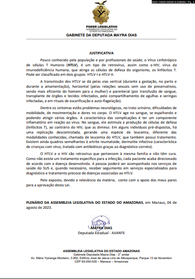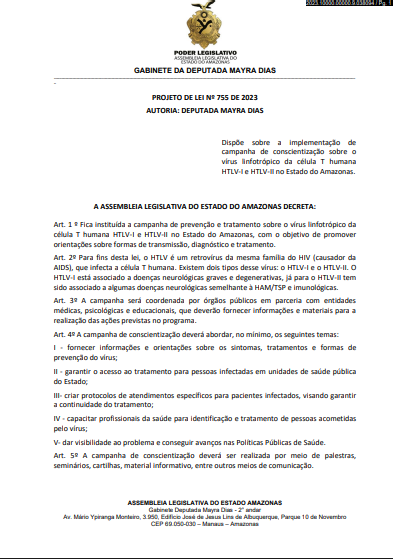 Entre as propostas consideradas mais relevantes está a Lei nº 6.767/2024, que institui a Campanha Permanente de Conscientização sobre o Vírus HTLV-I/II no Amazonas. A medida busca ampliar o diagnóstico e a prevenção da doença, pouco conhecida, mas com alta incidência na Região Norte. A campanha inclui capacitação de profissionais da saúde, produção de materiais informativos e incentivo à testagem.