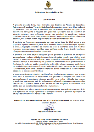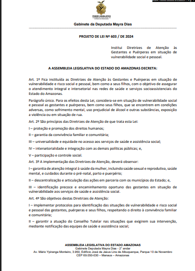 Outro destaque é o Projeto de Lei nº 603/2024, que estabelece diretrizes de atenção e acolhimento a gestantes e puérperas em situação de vulnerabilidade social. O texto propõe integração entre as redes de saúde, assistência social e segurança pública para garantir atendimento humanizado e reduzir índices de mortalidade materna.